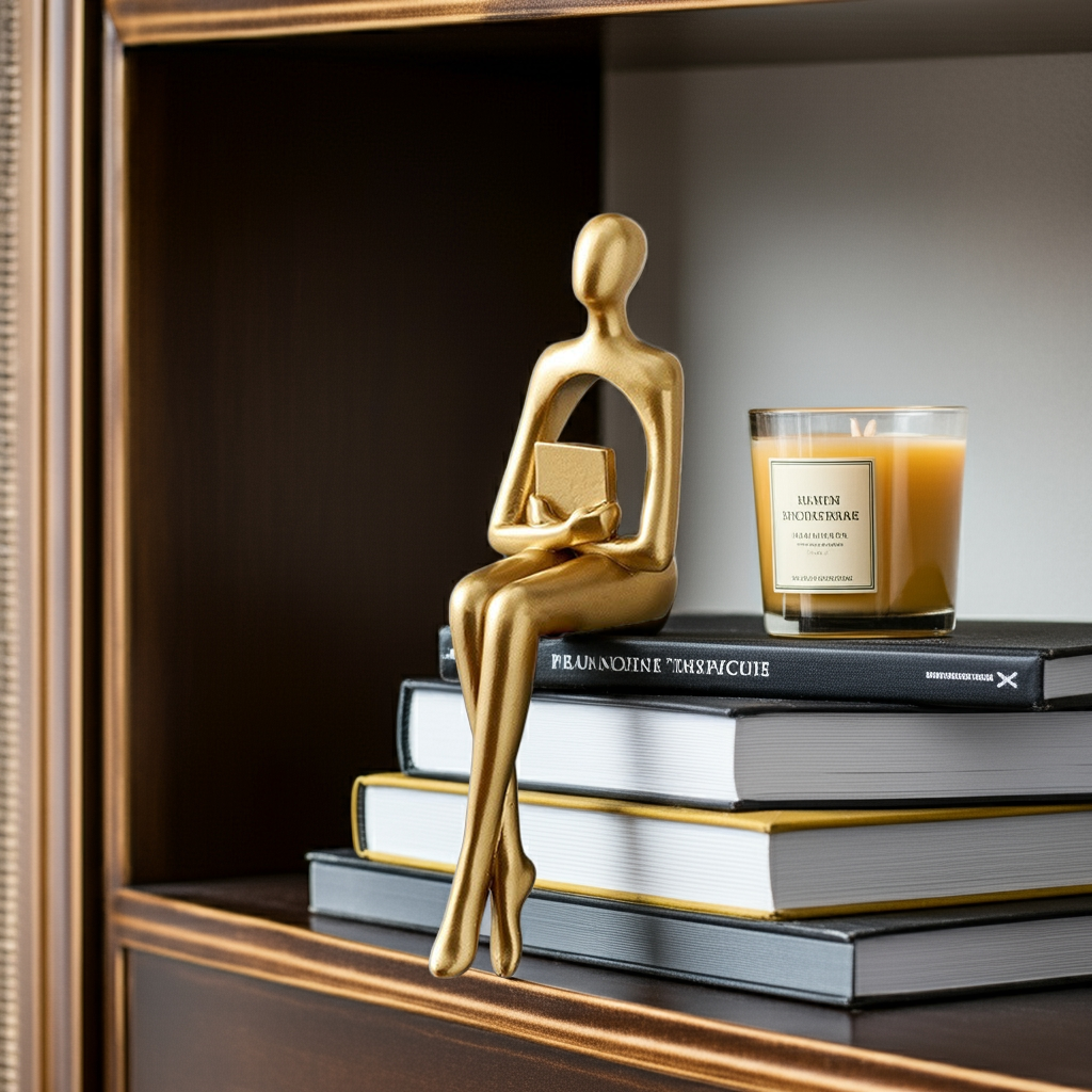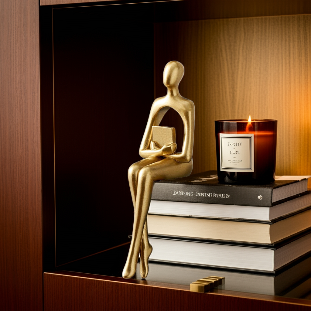 Esculturas contam histórias silenciosas. Esta peça abstrata, com linhas elegantes e acabamento dourado fosco, transmite serenidade, reflexão e sofisticação. Perfeita para compor estantes, aparadores e ambientes que valorizam o design emocional.